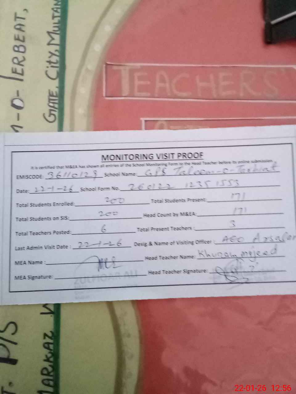 | EMIS Code: 36110129 | Name of School: GPS JAMIA TALEEM O TERBEAT INSIDE BOHER GATE MULTAN | |||