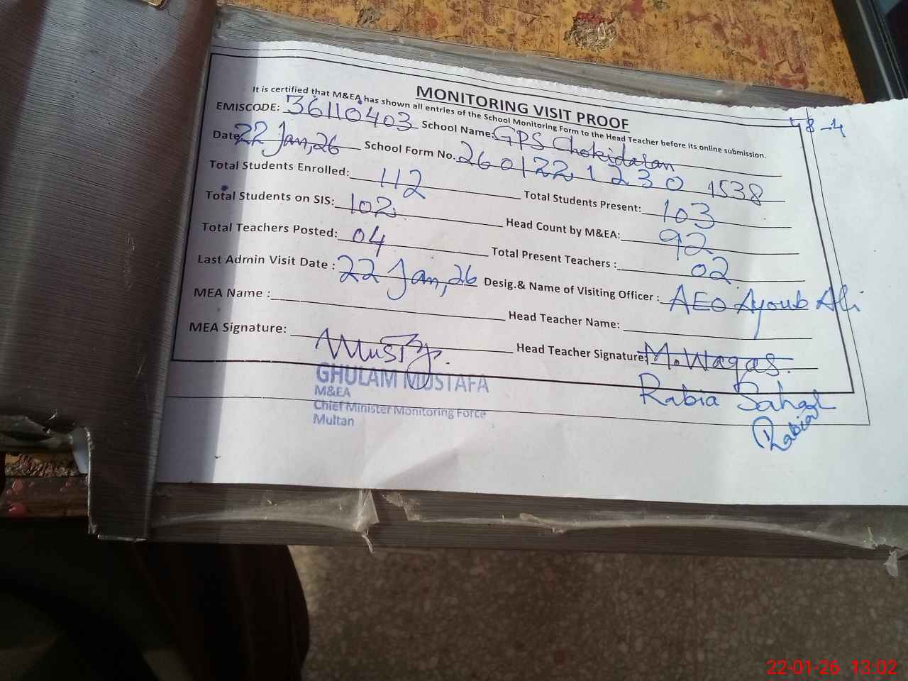 | Monitoring Date: 22-01-2026 | Start Time: 22-01-2026 12:27 PM | End Time: 22-01-2026 01:09 PM | Name of MEA: Gh**** Mu**** | |