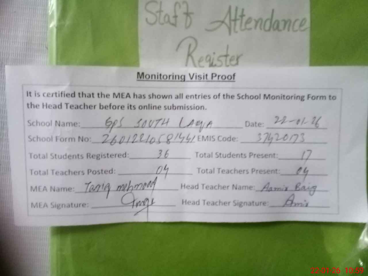 | Attendance Register | Head Teacher | MEA with School | Visit Proof |