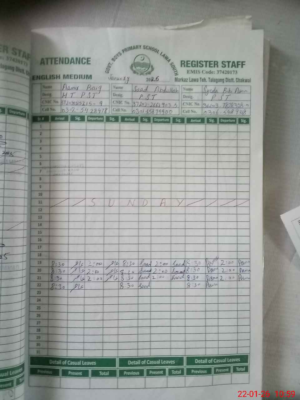 | CNIC | Full Name | Designation | R/C | Absence during last cal. month |