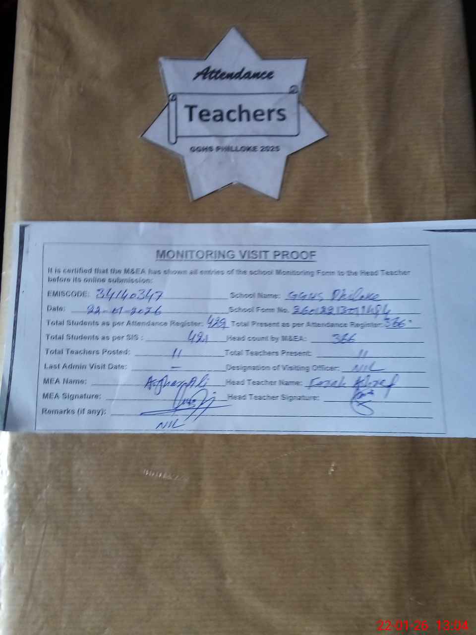 | Attendance Register | Head Teacher | MEA with School | Visit Proof |