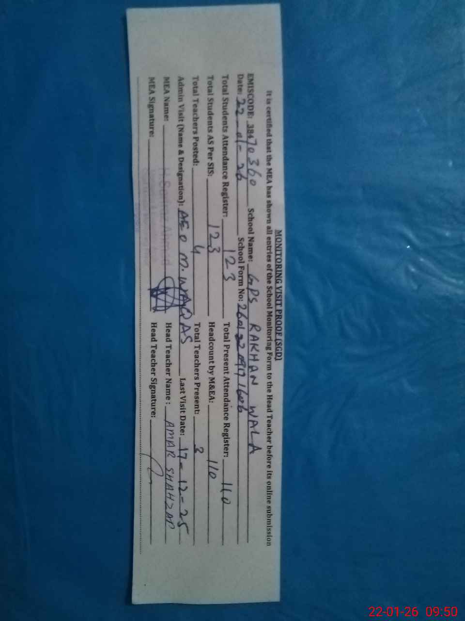 | Attendance Register | Head Teacher | MEA with School | Visit Proof |
