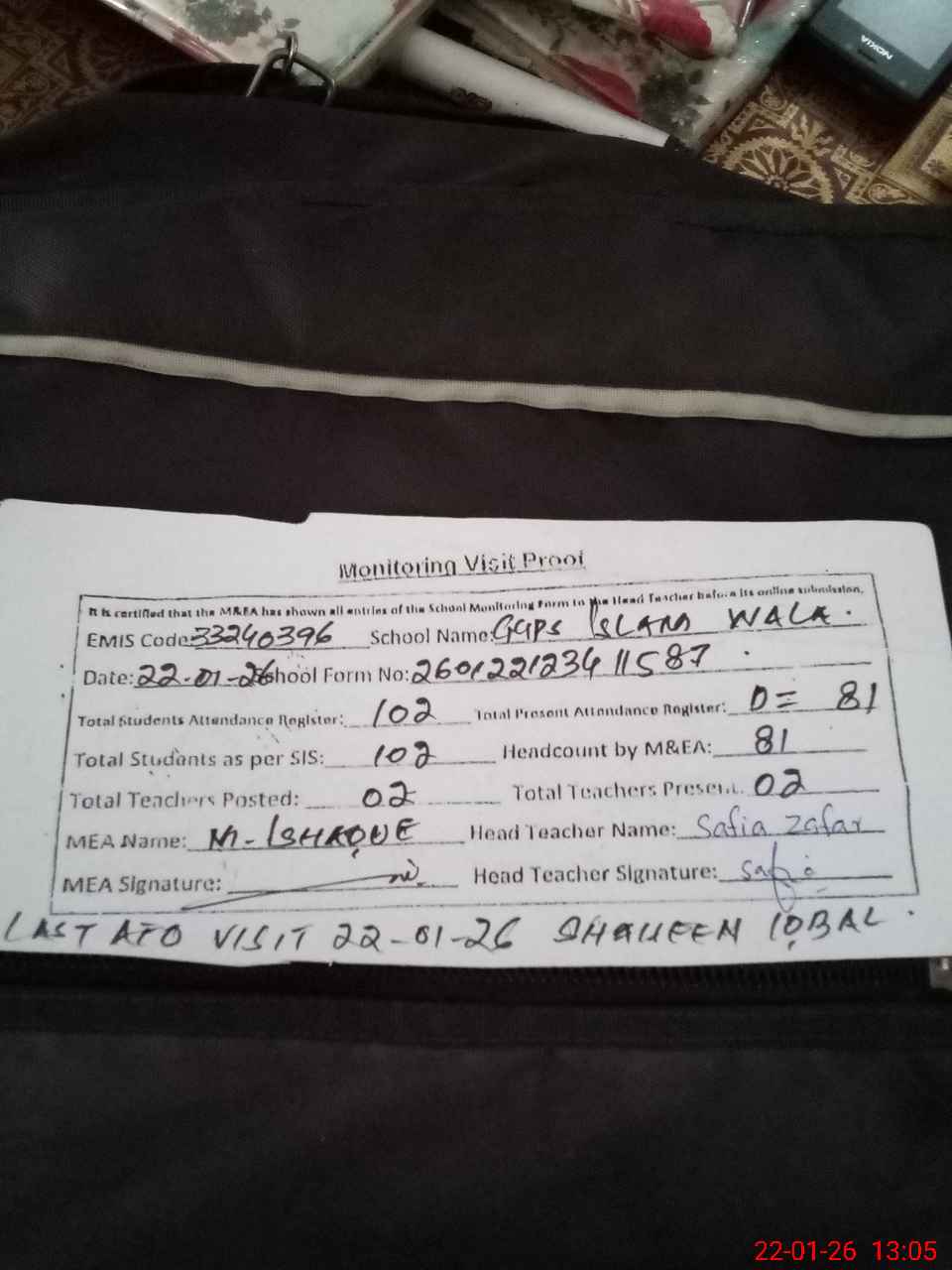 | Attendance Register | Head Teacher | MEA with School | Visit Proof |