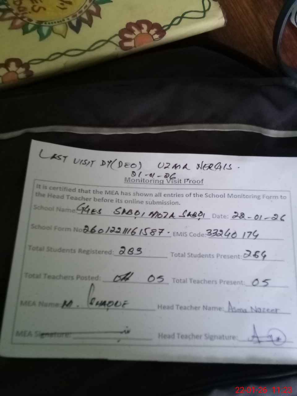| Attendance Register | Head Teacher | MEA with School | Visit Proof |