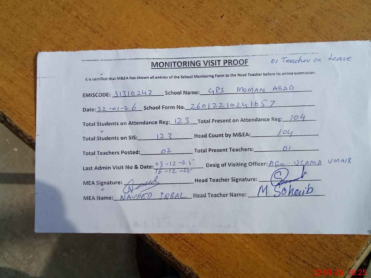 | Attendance Register | Head Teacher | MEA with School | Visit Proof |