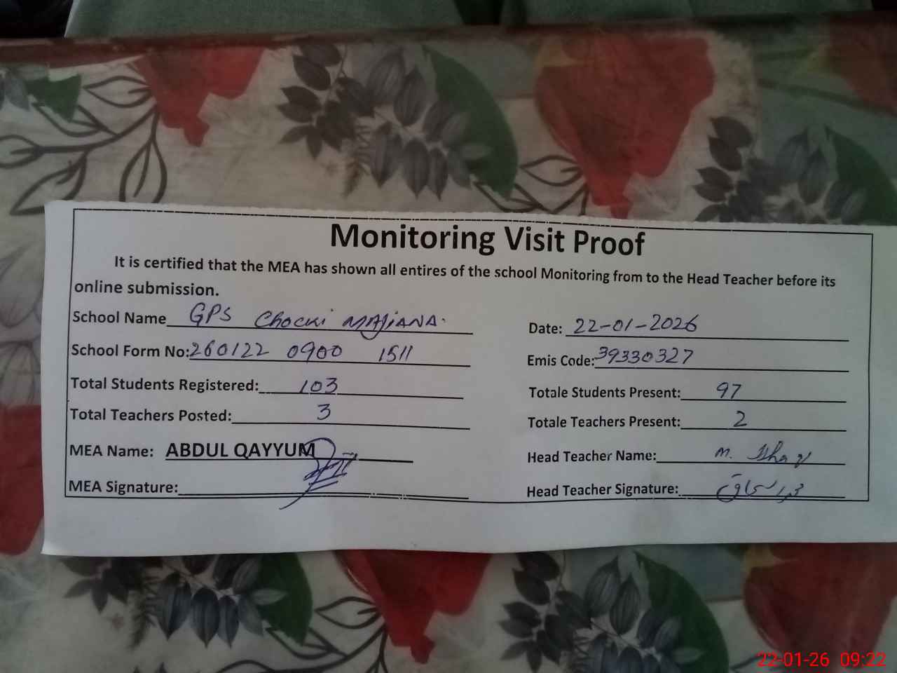 | Attendance Register | Head Teacher | MEA with School | Visit Proof |