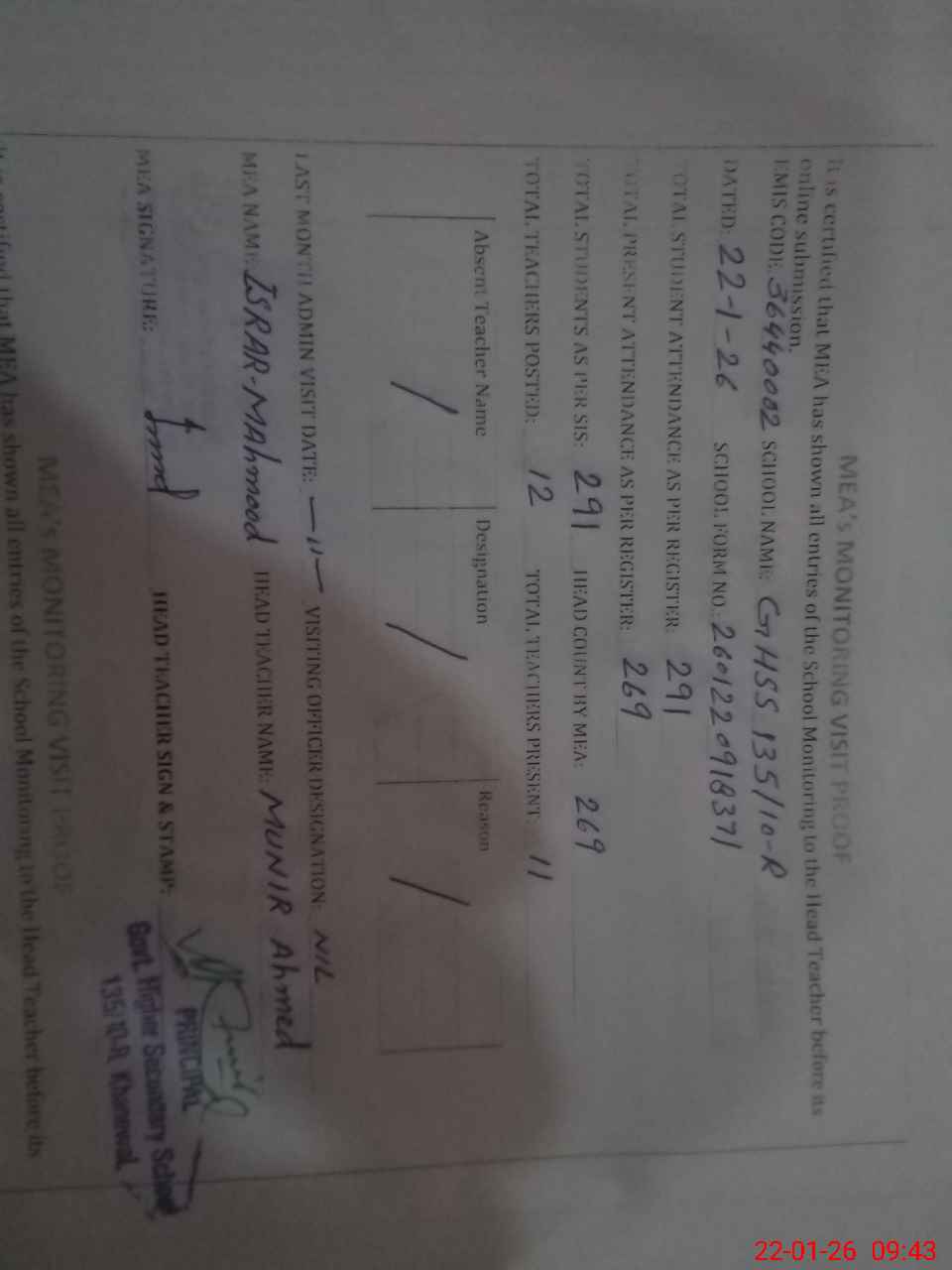 | Attendance Register | Head Teacher | MEA with School | Visit Proof |