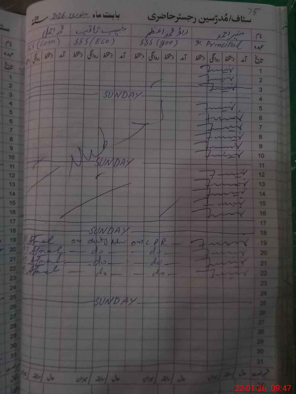 | CNIC | Full Name | Designation | R/C | Absence during last cal. month |