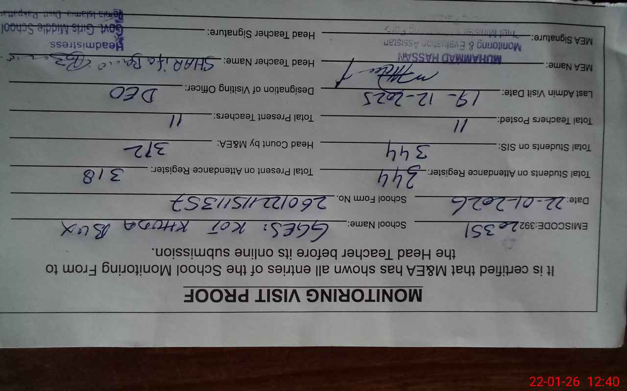 | Certified that this School was Inspected by the Undersigned MEA/DMO Today and the Information Stated Above is as Per Record. | |||||