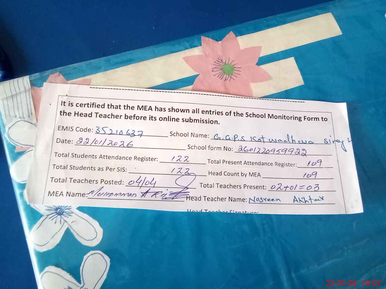 | Attendance Register | Head Teacher | MEA with School | Visit Proof |