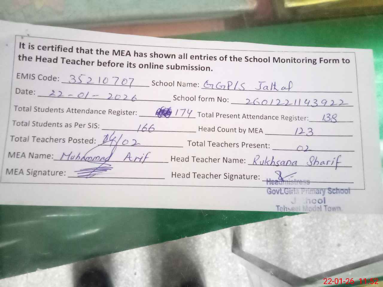 | EMIS Code: 35210707 | Name of School: GGPS JATHOL TEHSIL MODEL TOWN | |||
