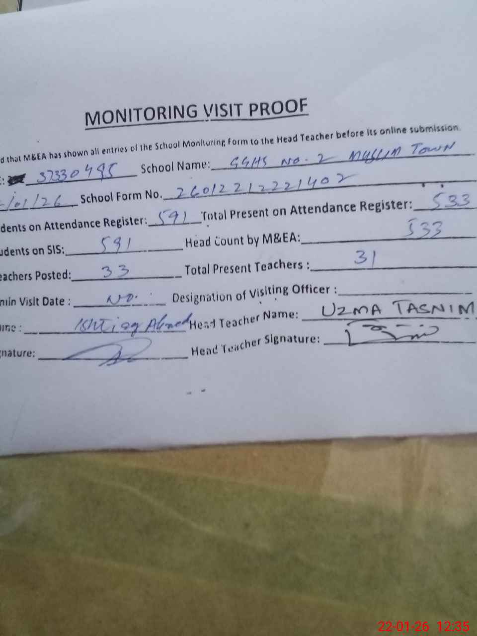 | Attendance Register | Head Teacher | MEA with School | Visit Proof |