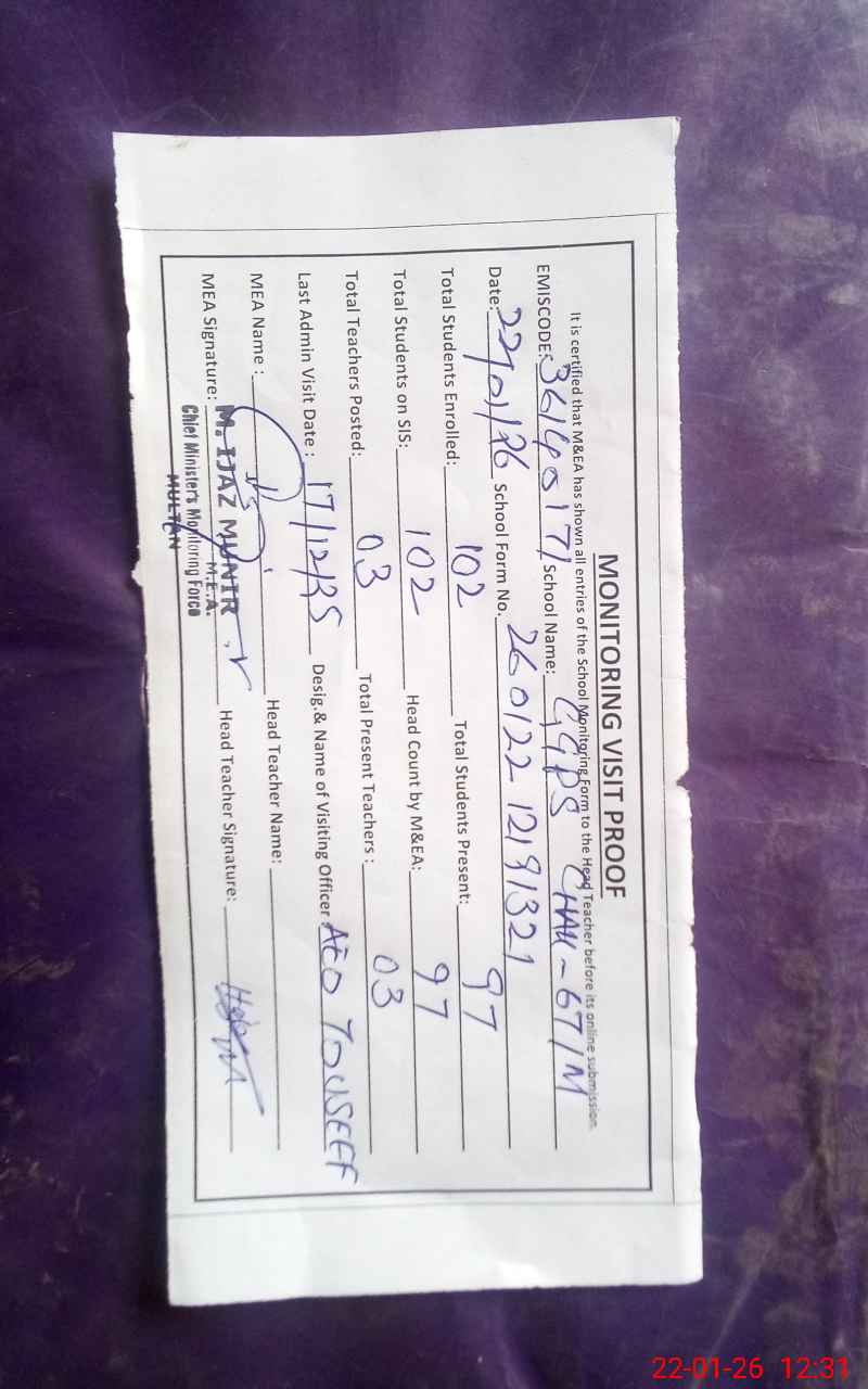 | Name: HA**** MA**** Designation: (School Headmaster's/Headmistress's) PST/PTC/JV Phone/Cell Number: 03**** |