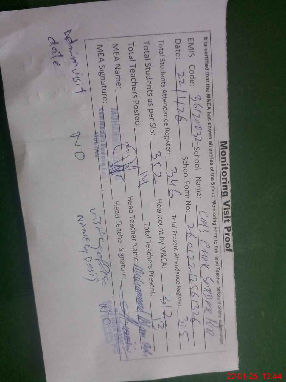| Attendance Register | Head Teacher | MEA with School | Visit Proof |