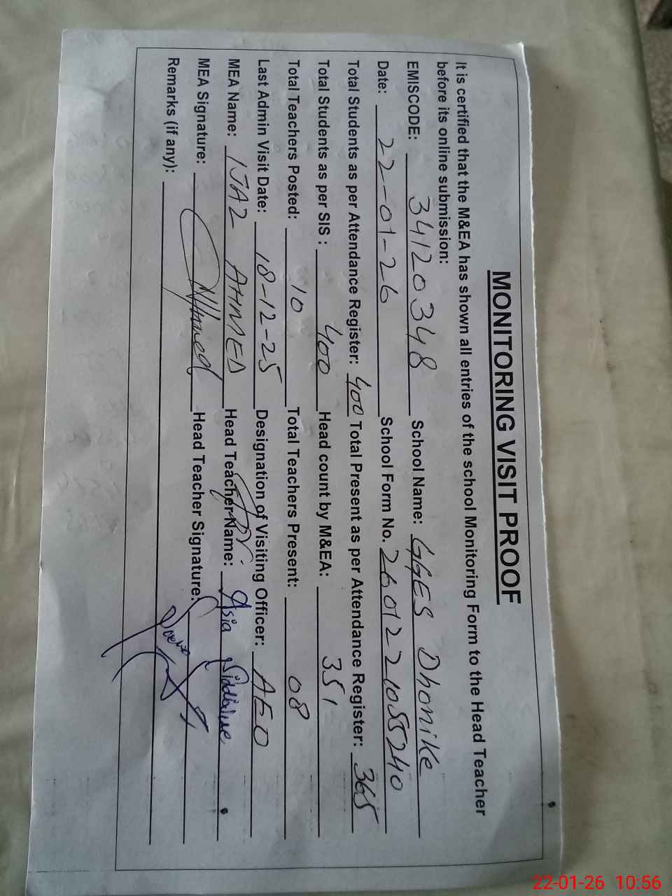 | Attendance Register | Head Teacher | MEA with School | Visit Proof |