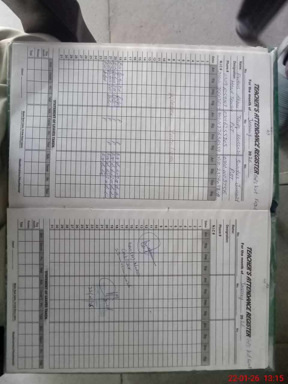 | Name: FI**** AK**** Designation: (School Headmaster's/Headmistress's) PST Phone/Cell Number: 03**** |