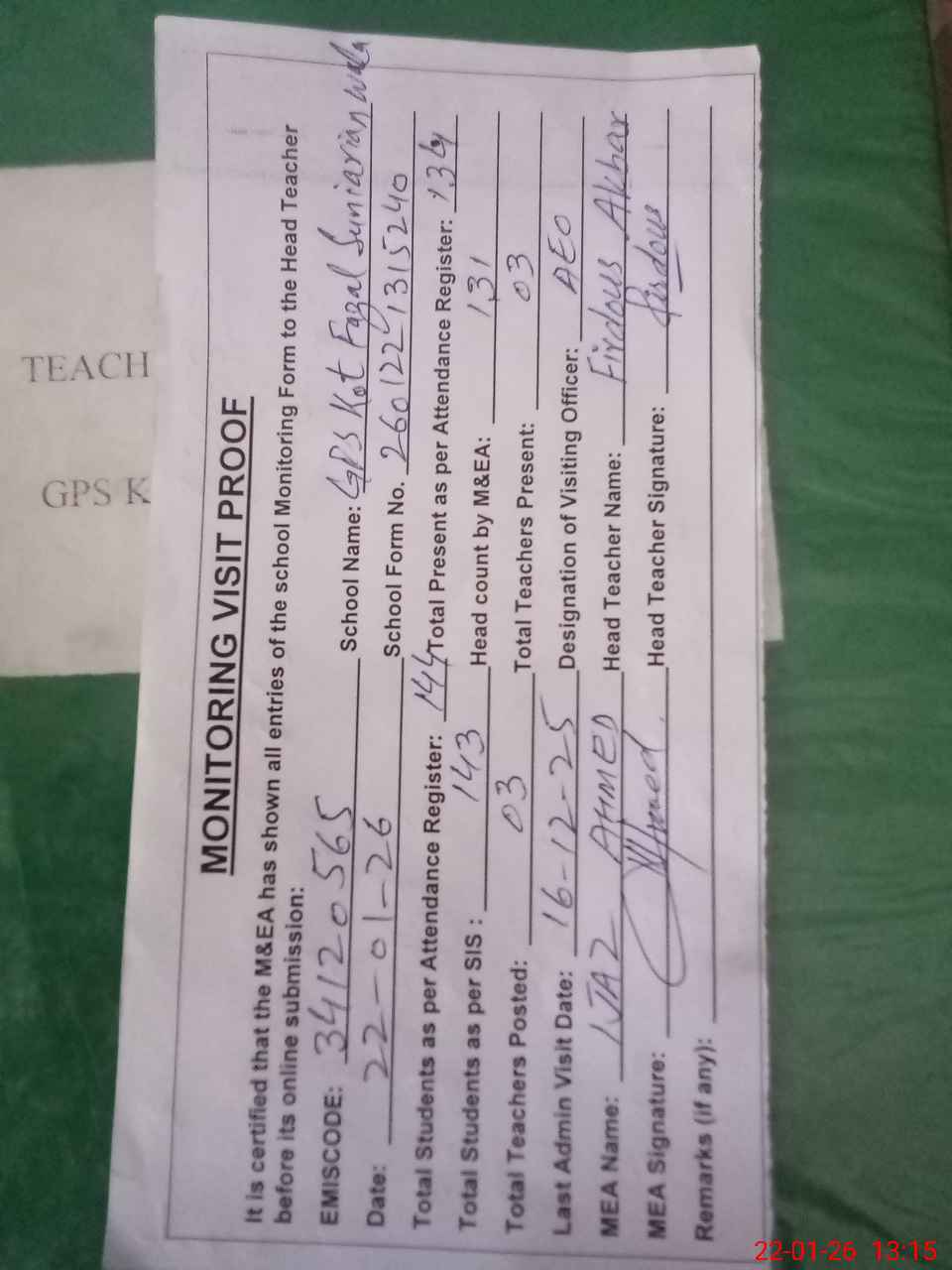 | Attendance Register | Head Teacher | MEA with School | Visit Proof |