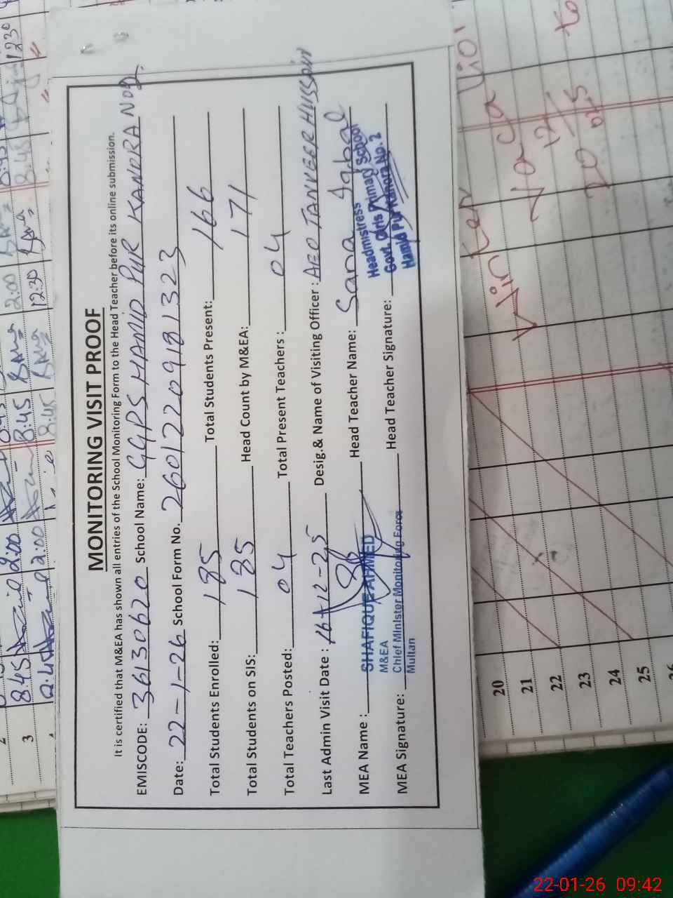 | Attendance Register | Head Teacher | MEA with School | Visit Proof |