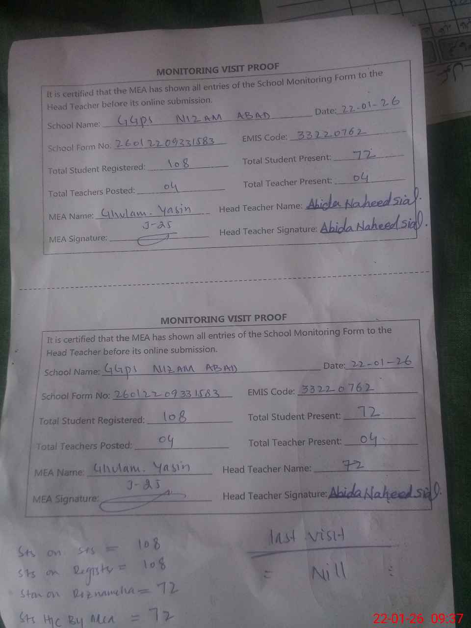 | Attendance Register | Head Teacher | MEA with School | Visit Proof |