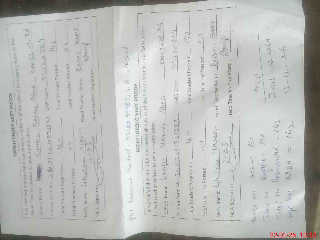 | Attendance Register | Head Teacher | MEA with School | Visit Proof |