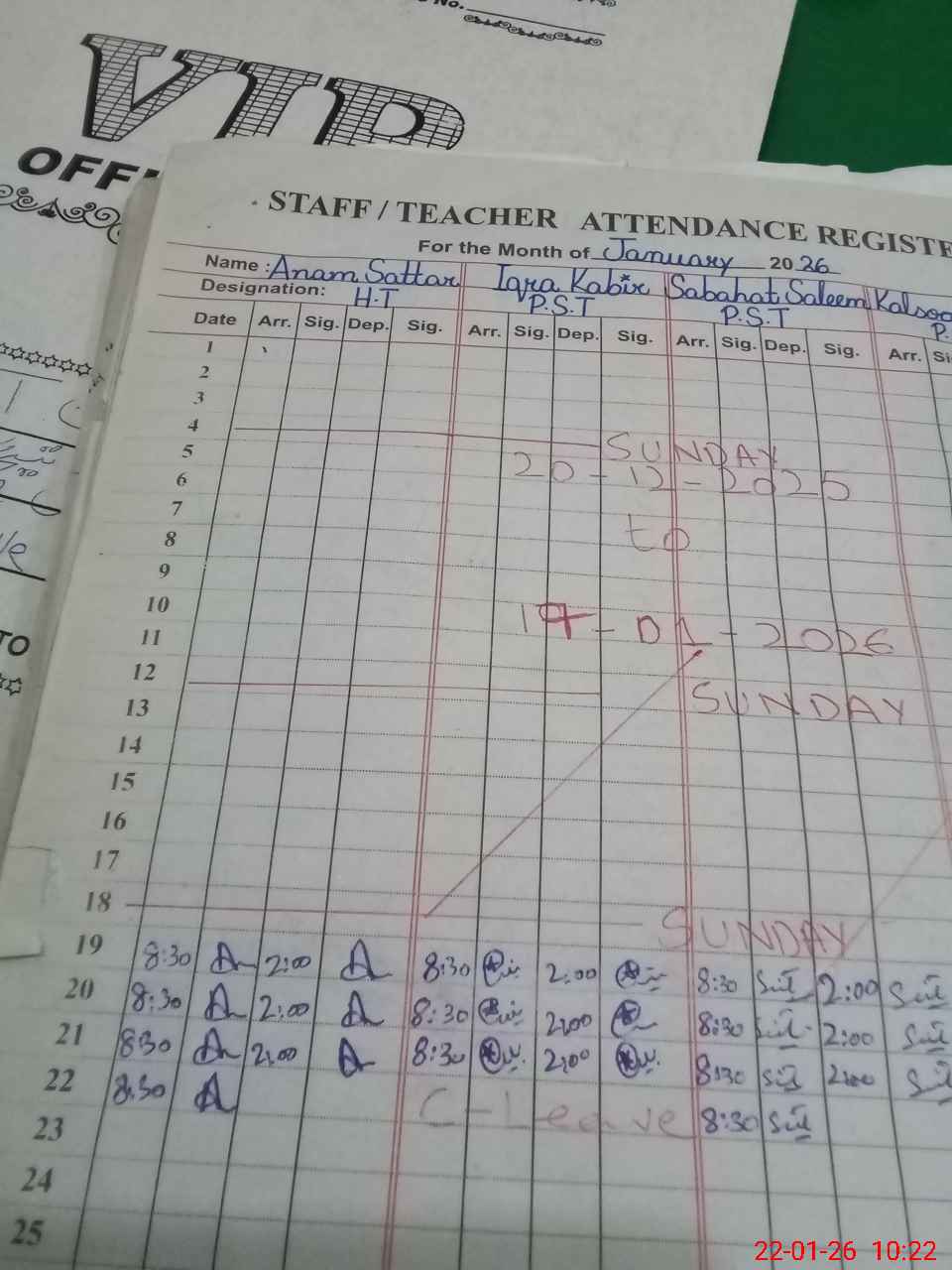| CNIC | Full Name | Designation | R/C | Absence During Last Calender Month |