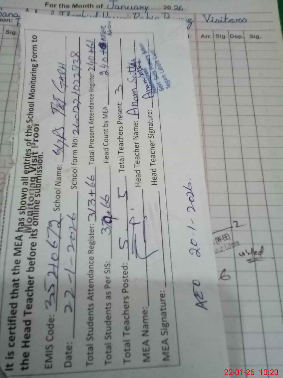 | Attendance Register | Head Teacher | MEA with School | Visit Proof |