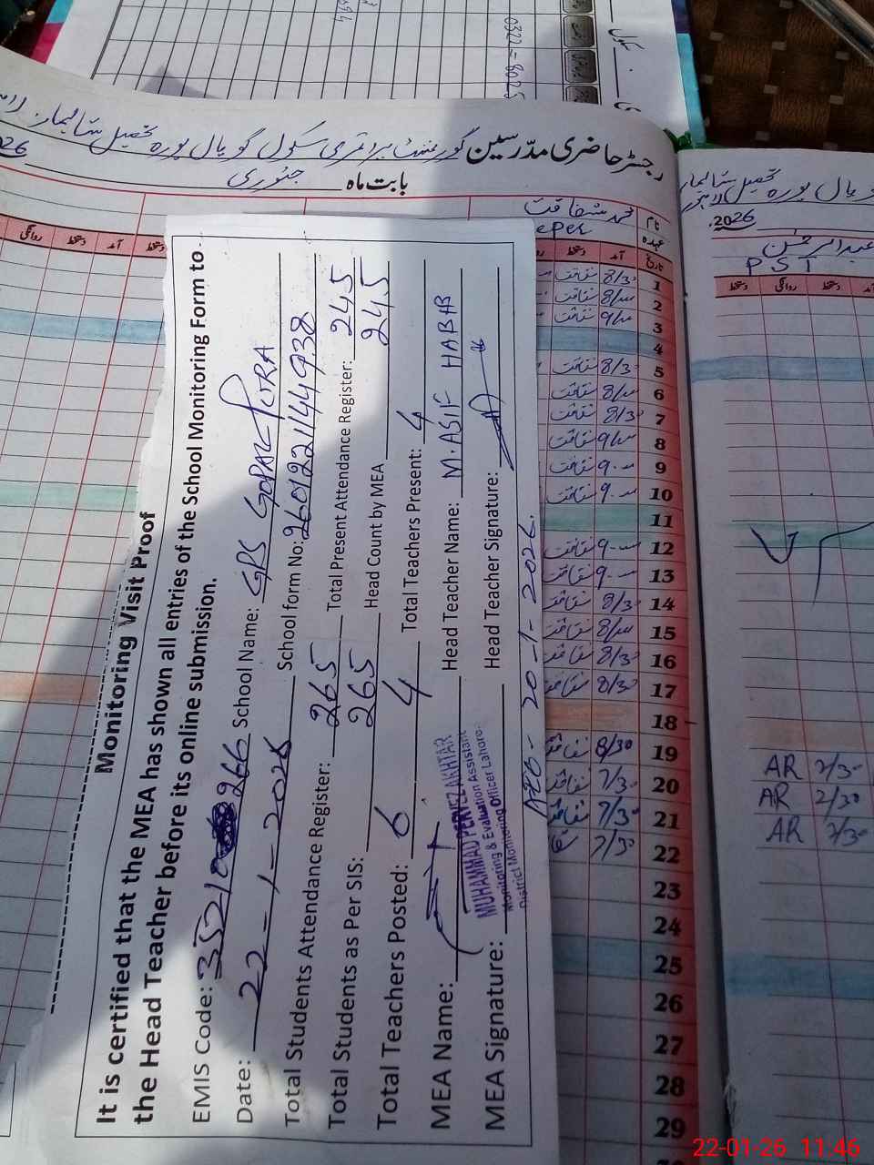 | Attendance Register | Head Teacher | MEA with School | Visit Proof |