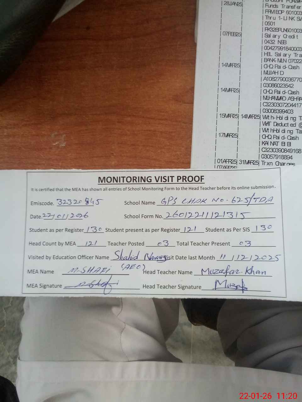 | EMIS Code: 32320845 | Name of School: GPS CHAK NO.625 TDA | |||