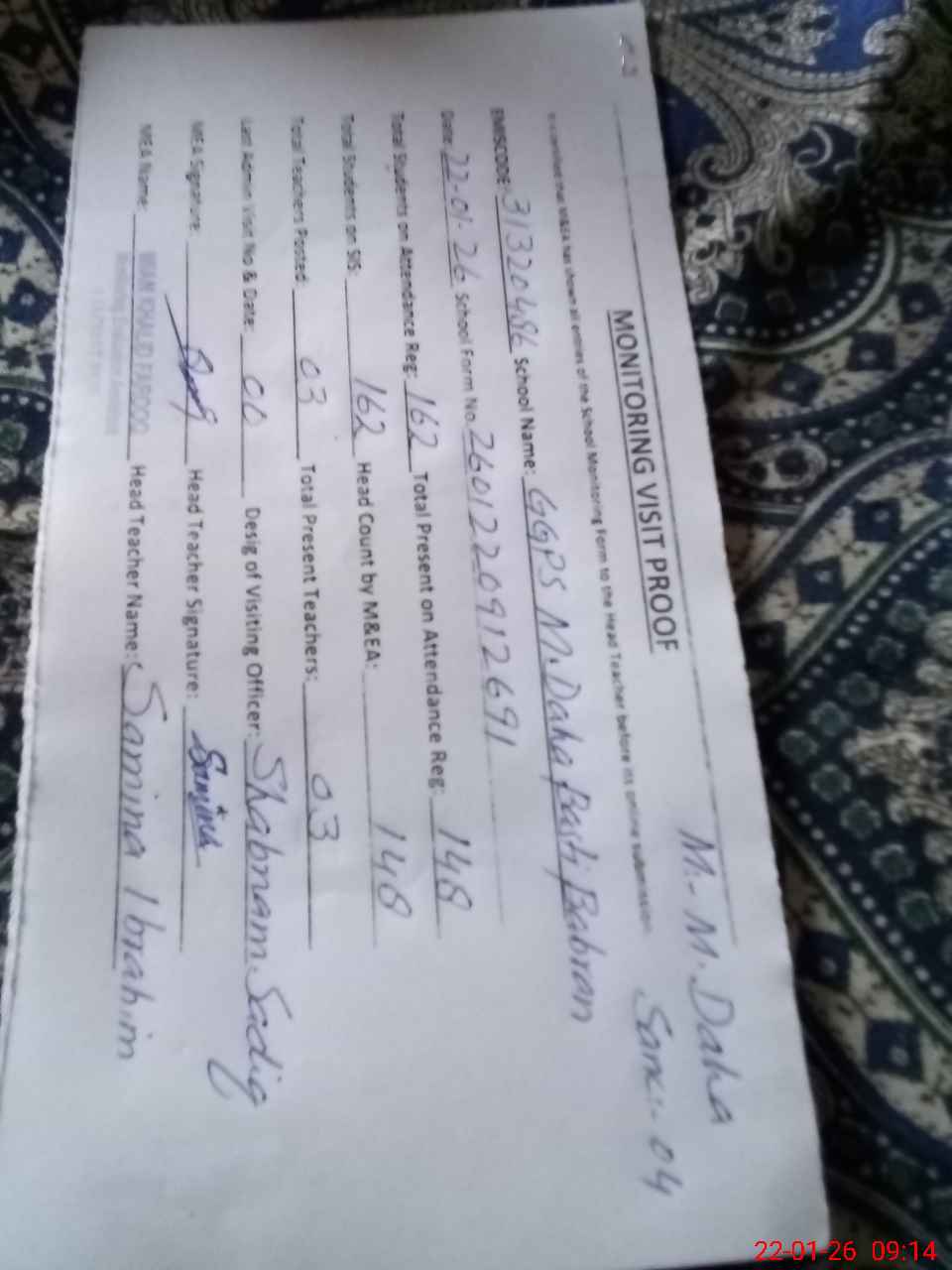 | Attendance Register | Head Teacher | MEA with School | Visit Proof |