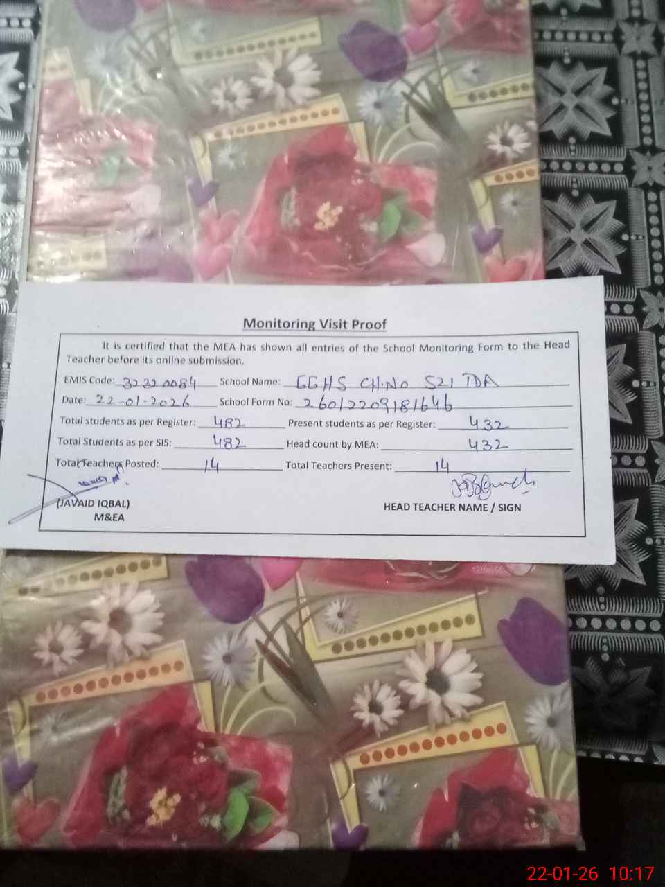 | Attendance Register | Head Teacher | MEA with School | Visit Proof |