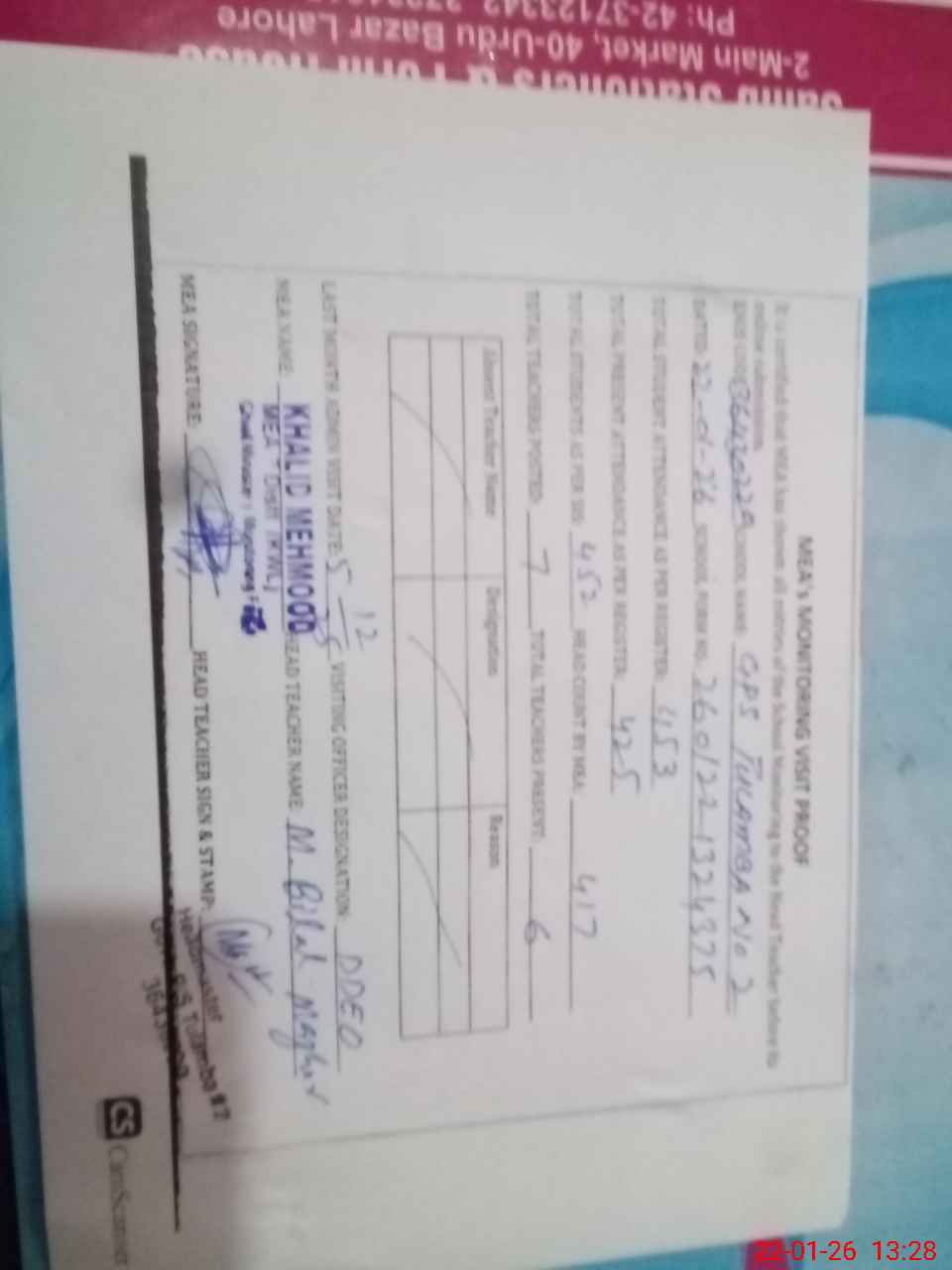 | Attendance Register | Head Teacher | MEA with School | Visit Proof |