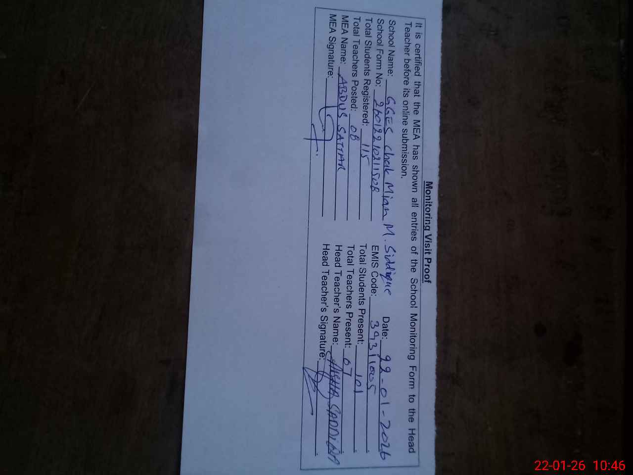 | Certified that this School was Inspected by the Undersigned MEA/DMO Today and the Information Stated Above is as Per Record. | |||||