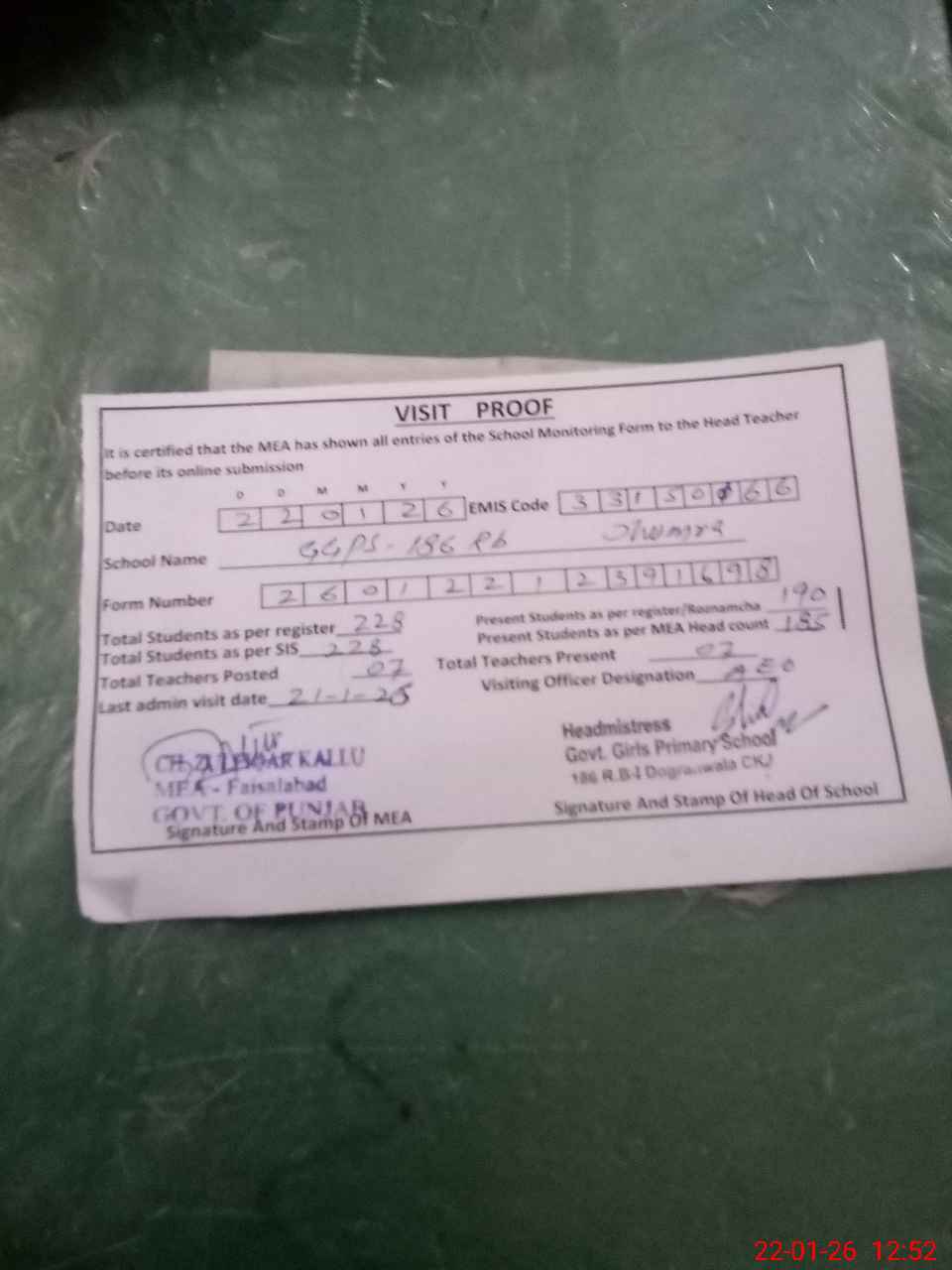 | Certified that this School was Inspected by the Undersigned MEA/DMO Today and the Information Stated Above is as Per Record. | |||||