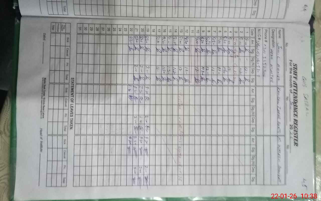 | CNIC | Full Name | Designation | R/C | Absence During Last Calender Month |