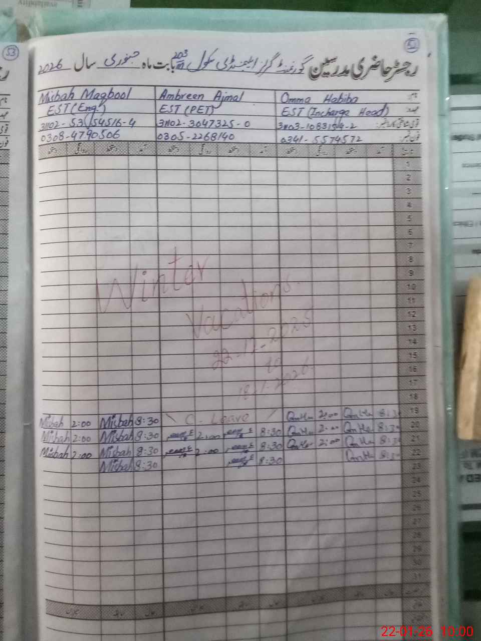 | Name: Um**** Ha**** Designation: (School Headmaster's/Headmistress's) EST AT Phone/Cell Number: 03**** |