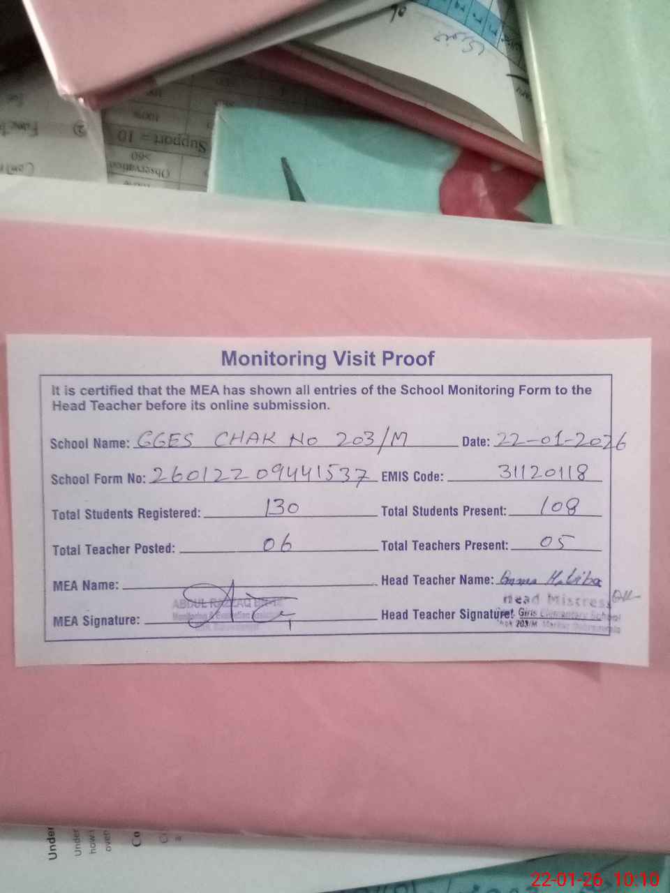 | Attendance Register | Head Teacher | MEA with School | Visit Proof |