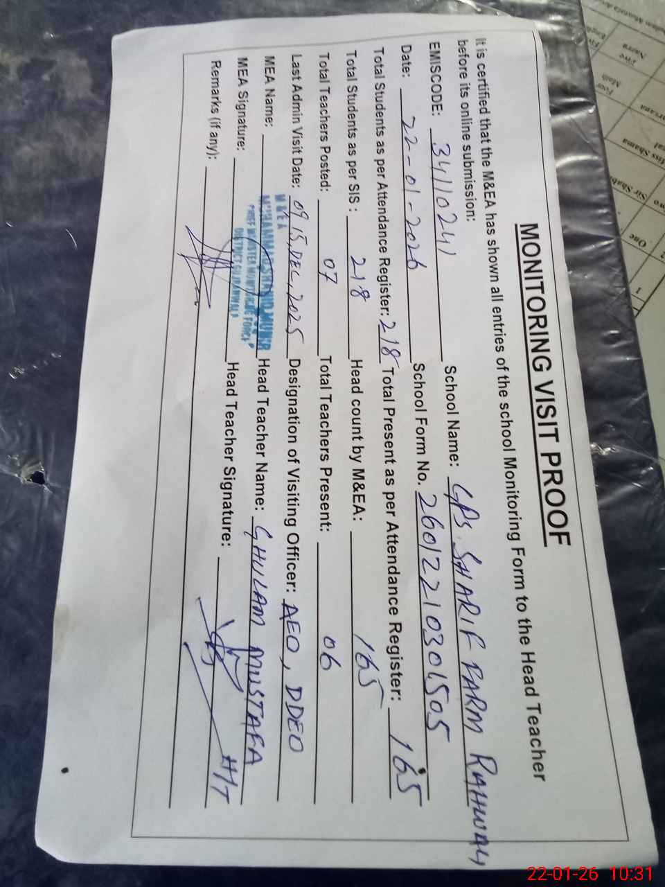 | Attendance Register | Head Teacher | MEA with School | Visit Proof |