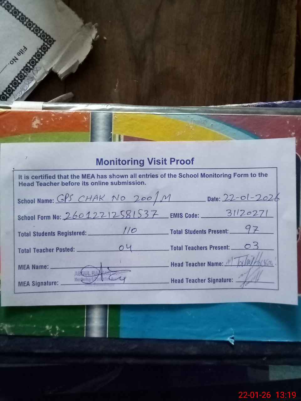 | Attendance Register | Head Teacher | MEA with School | Visit Proof |