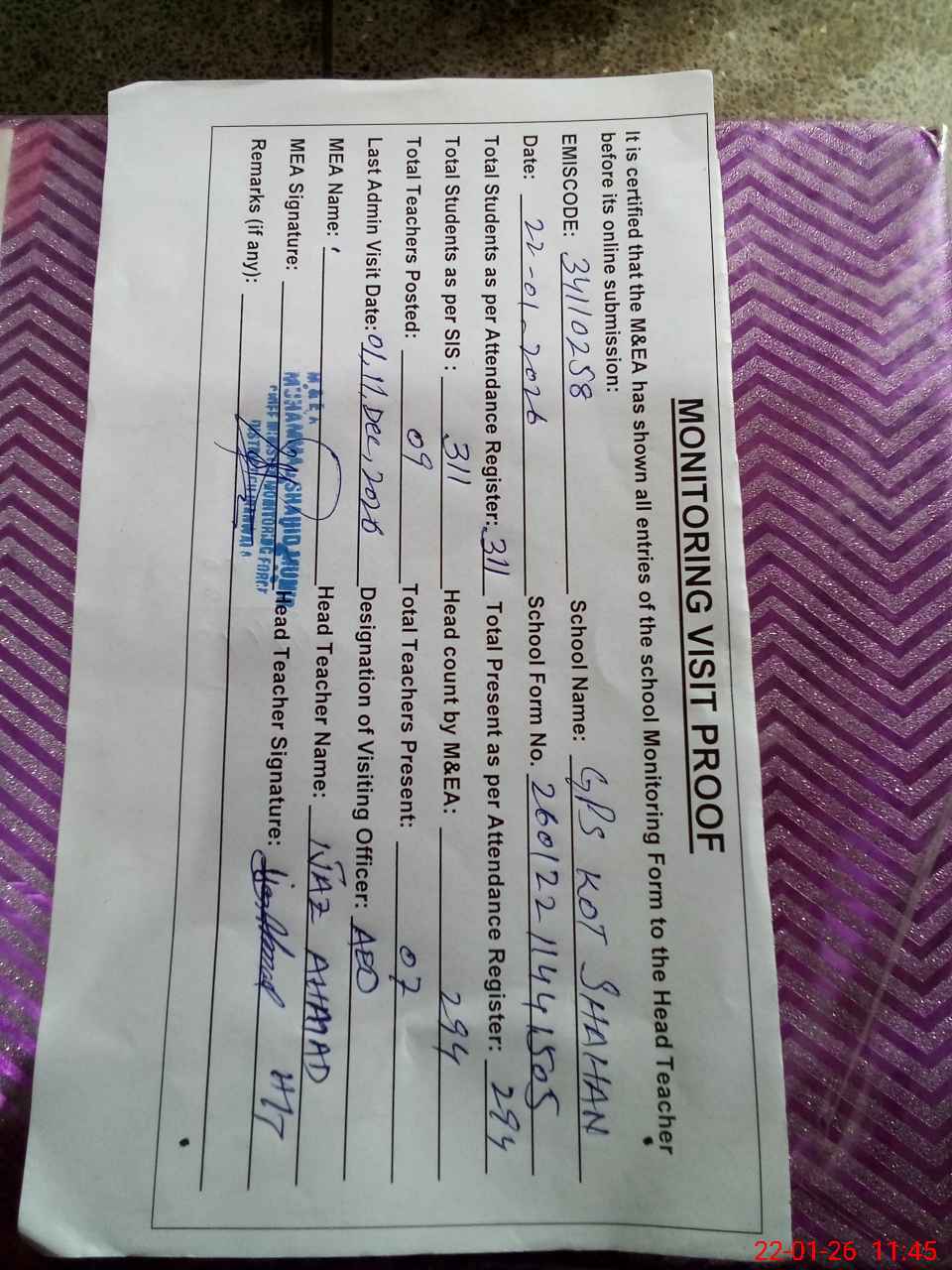 | Attendance Register | Head Teacher | MEA with School | Visit Proof |