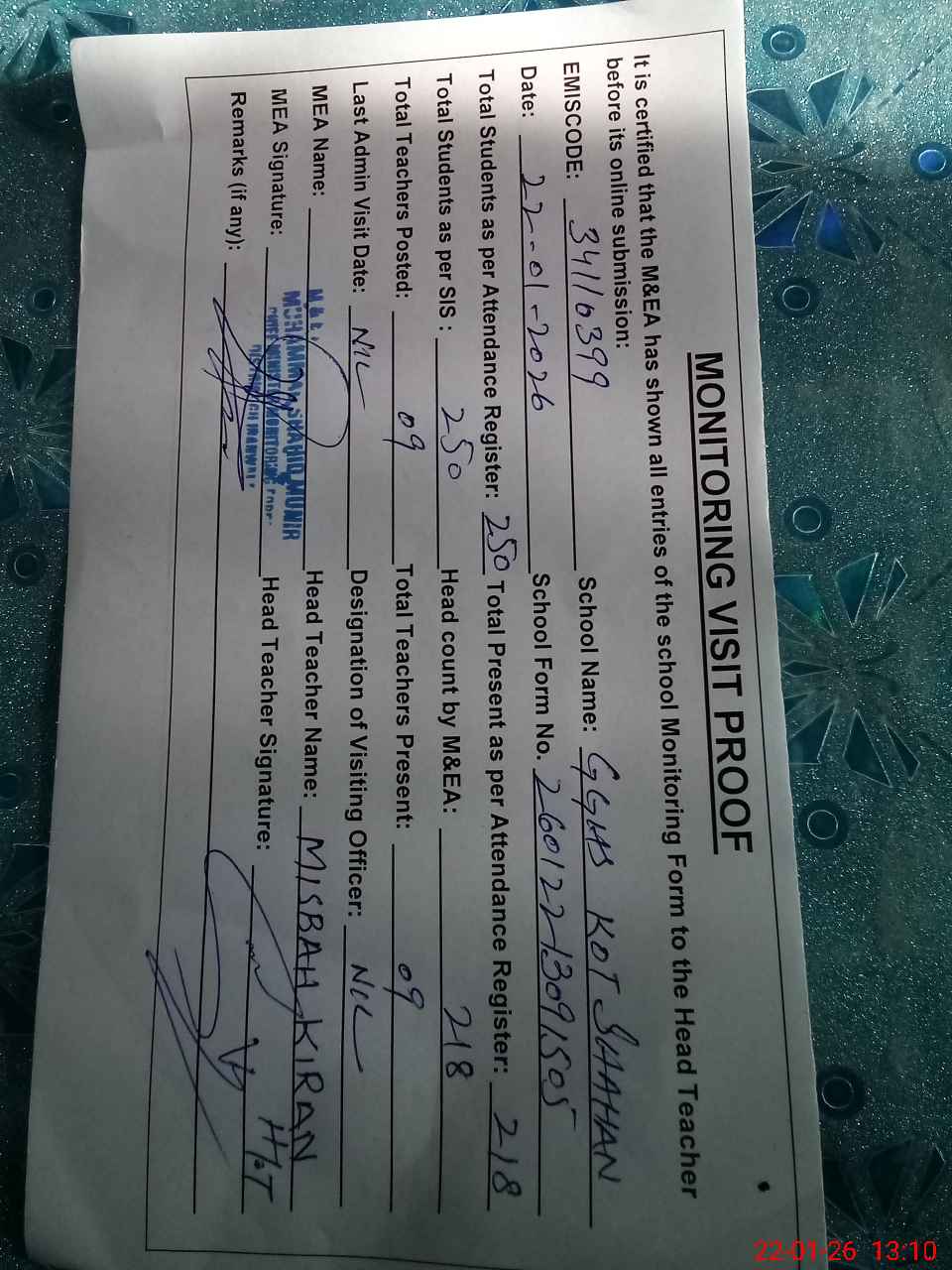| Attendance Register | Head Teacher | MEA with School | Visit Proof |