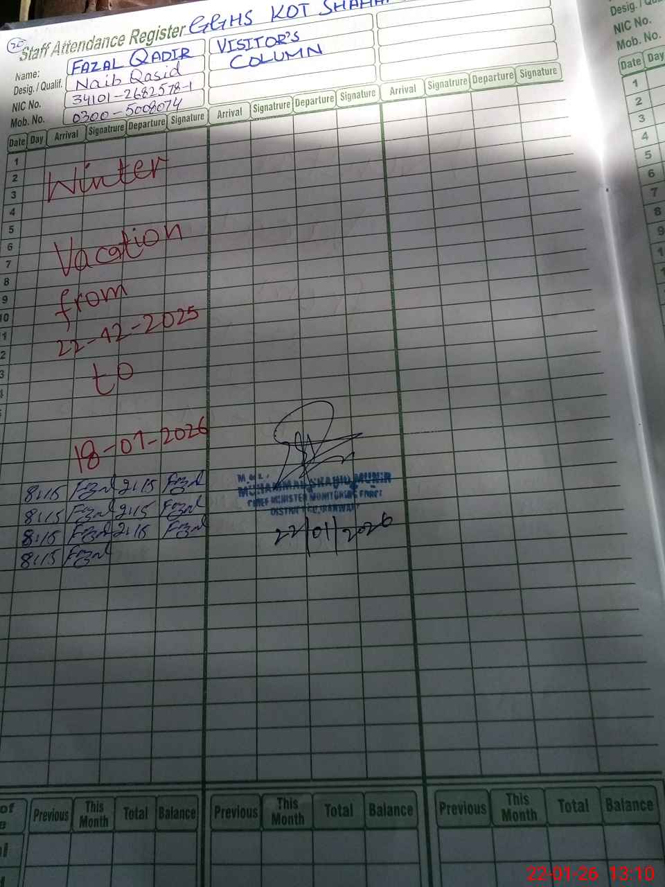 | CNIC | Full Name | Designation | R/C | Absence during last cal. month |
