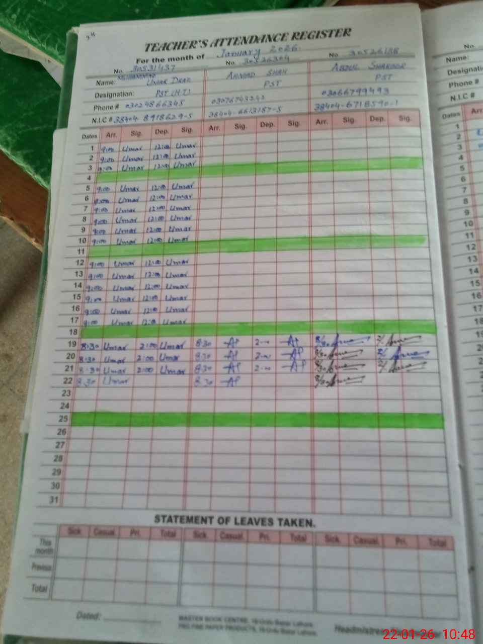 | CNIC | Full Name | Designation | R/C | Absence During Last Calender Month |