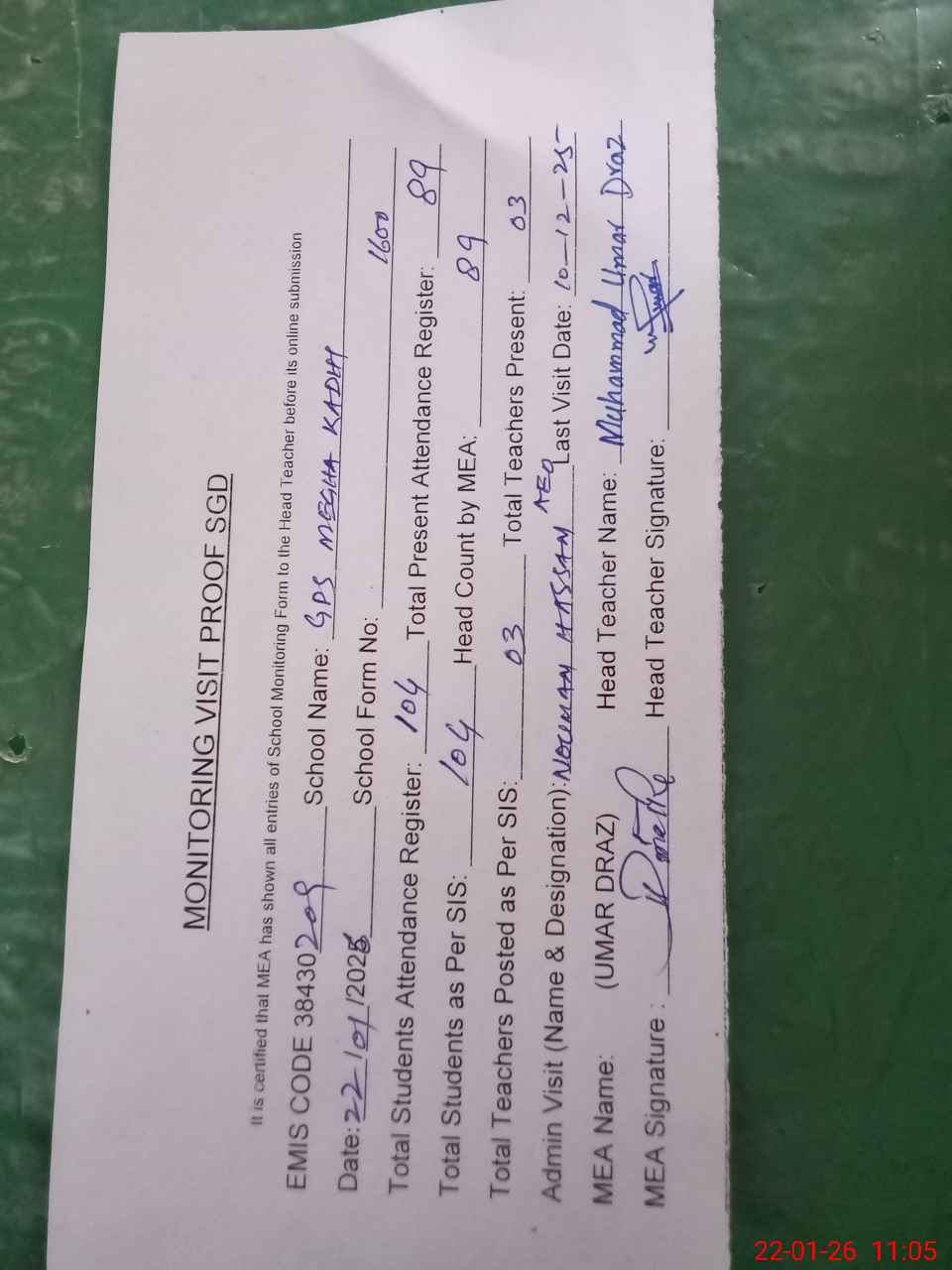 | Attendance Register | Head Teacher | MEA with School | Visit Proof |