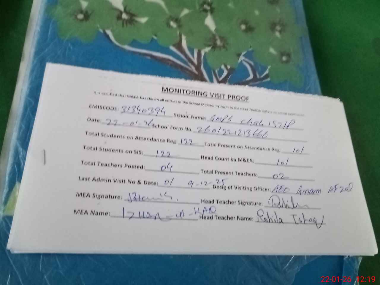 | Attendance Register | Head Teacher | MEA with School | Visit Proof |