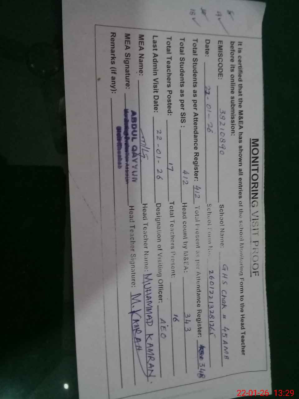 | Attendance Register | Head Teacher | MEA with School | Visit Proof |