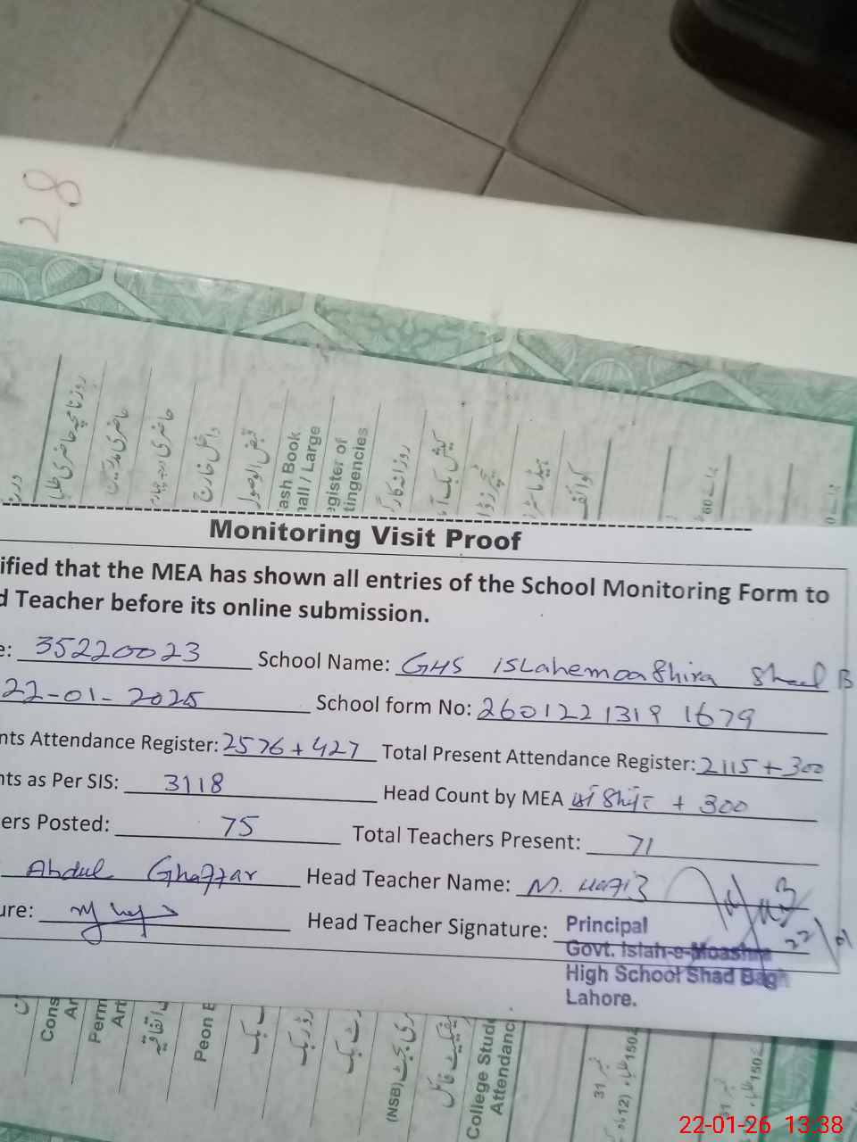 | Attendance Register | Head Teacher | MEA with School | Visit Proof |