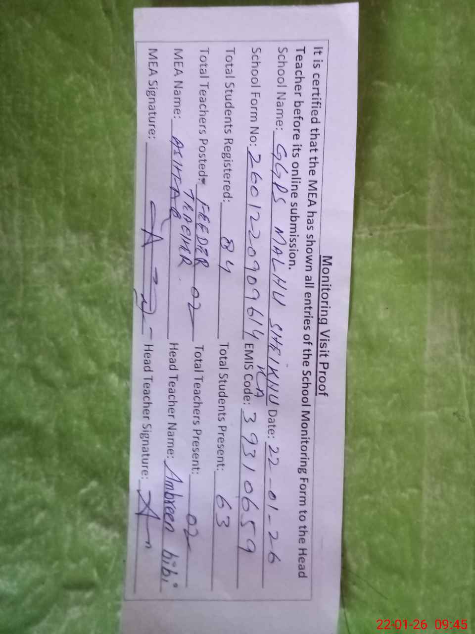 | Attendance Register | Head Teacher | MEA with School | Visit Proof |