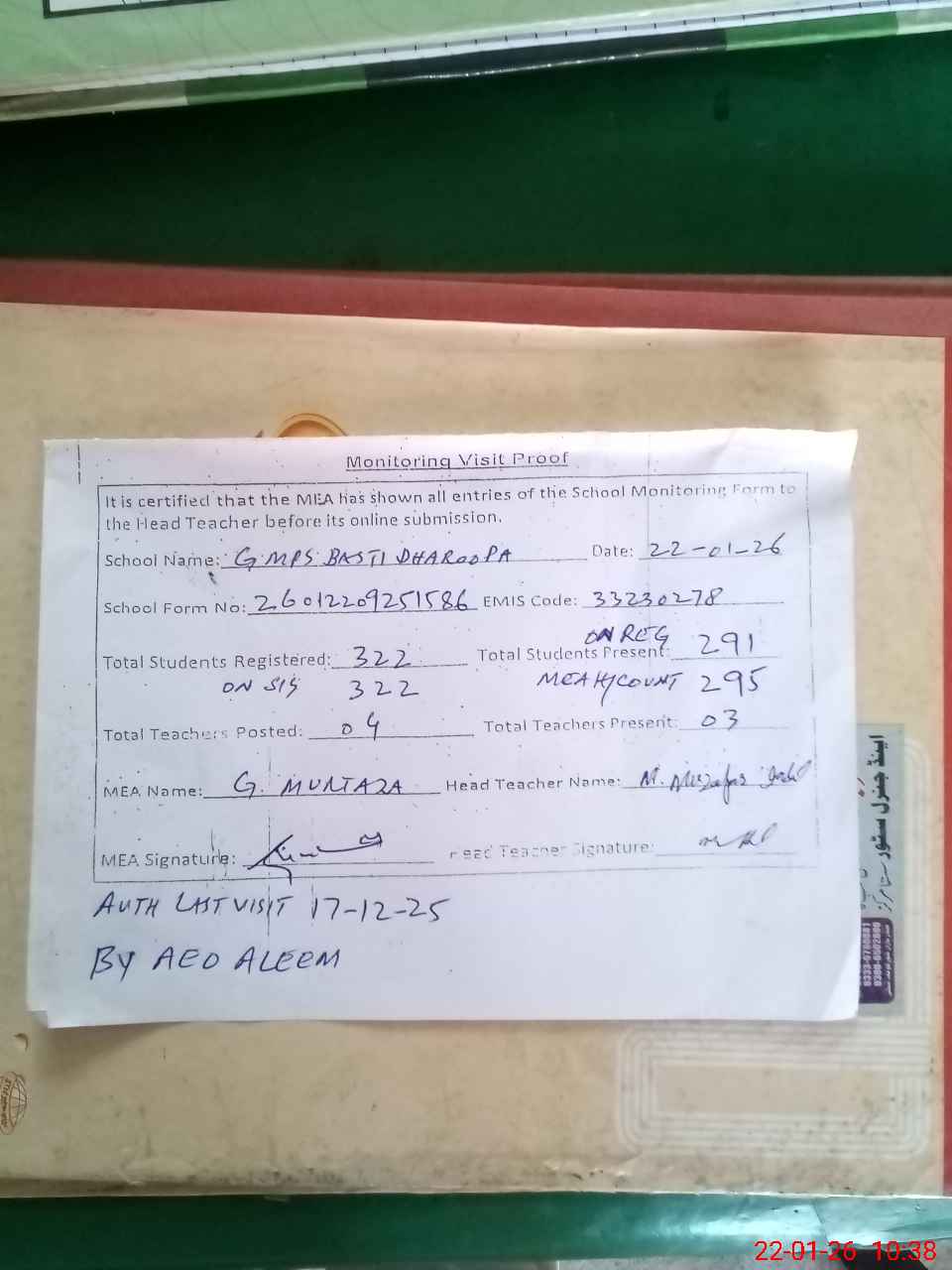 | Attendance Register | Head Teacher | MEA with School | Visit Proof |