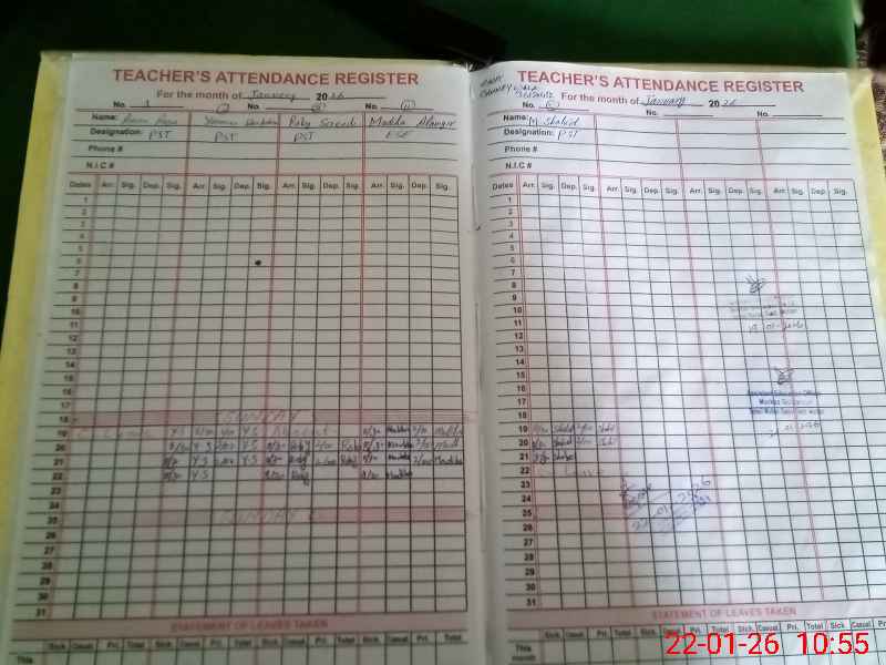 | Total no. of Classrooms: 5 No. of Classrooms Used for Teaching: 5 No. of Classrooms Storing Old Furniture, FTBs, etc: 0Comments if Any: PST AMNA RAZA IS ABSENT DUE TO NO PROOF OF LEAVE IS AVILABLE IN SCHOOL TODAY TEACHER GUIDE BOOKS RECORD NOT NOTED BY SCHOOL STAFF |
