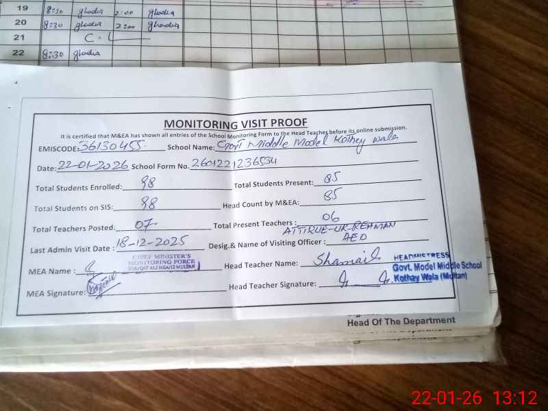 | EMIS Code: 36130455 | Name of School: Govt. Model Middle School Kothey Wala Multan | |||